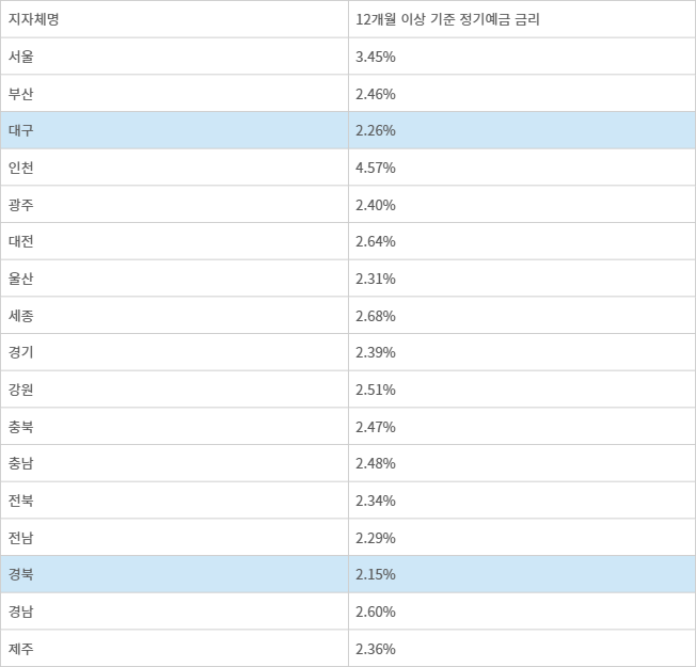 전국 17개 시도의 지자체 금고 이자율이 공개되면서 지자체별 금리 차이 배경에 관심이 쏠린다. 28일 행정안전부가 '지방재정 365'를 통해 공개한 '지방정부 금고 주요 항목별 적용 금리 현황'에 따르면 1금고 기준 대구와 경북의 12개월 이상 정기예금 이자율은 각각 2.26%, 2.15%다. 전국 243개 지방정부 금고 이자율(12개월 이상 정기예금 기준)은 전국 평균 2.53%다. 인천은 4.57%로 가장 높다.