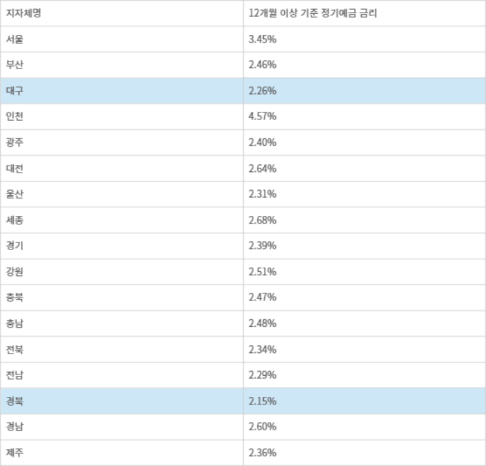 이날 행정안전부 '지방재정 365'에 공시된 현황에 따르면, 1금고(일반회계) 기준 대구시와 경북도의 12개월 정기예금 이자율은 각각 2.26%, 2.15%로 파악됐다. 이는 전국 243개 지방정부 평균인 2.53%보다 낮으며, 최고치를 기록한 인천(4.57%)과 비교하면 절반 수준에 불과하다. 이번 통계는 지난해 지방회계법 시행령 개정으로 금고 금리 공개가 의무화됨에 따라 처음으로 실거래 데이터가 외부로 드러난 결과다.